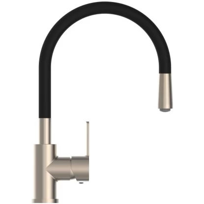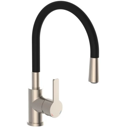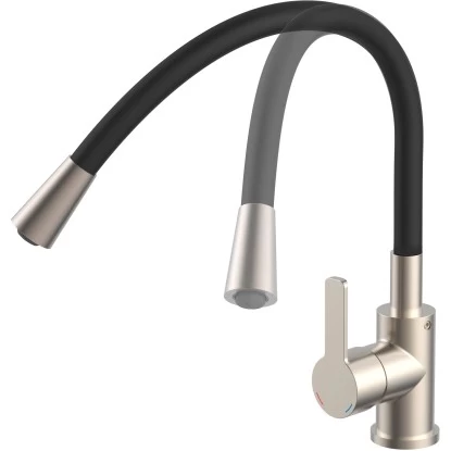 Flexo Spültischarmatur Edelstahloptik-Schwarz. Diese elegante Küchenarmatur ist eine gelungene Kombination aus Funktion und Design Der farbige Rundbogenauslauf in Soft-Touch Qualität ist nicht nur eine Hingucker für die Spüle, sondern auch noch in alle Richtungen biegsam für einen großen Aktionsradius.
