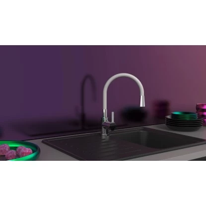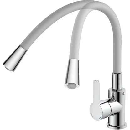 Flexo Spültischarmatur mit Soft-Touch Schlauch Chrom-Hellgrau. Diese elegante Küchenarmatur ist eine gelungene Kombination aus Funktion und Design Der farbige Rundbogenauslauf in Soft-Touch Qualität ist nicht nur eine Hingucker für die Spüle, sondern auch noch in alle Richtungen biegsam für einen großen Aktionsradius.