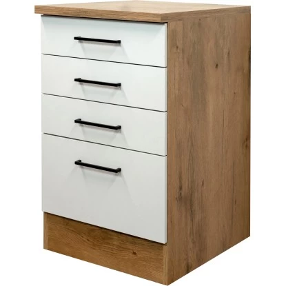 Der 50 cm breite Schubkastenschrank weiß durch eine hochwertige Verarbeitung sowie Materialauswahl zu gefallen und garantiert Ihnen auch auf kleinen Flächen ein Höchstmaß an Stauraum. Dabei verfügt der kompakte Schubkastenschrank neben drei Schubkästen auch über einen Auszug.