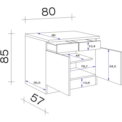 Der 80 cm breite Unterschrank weiß durch eine hochwertige Verarbeitung sowie Materialauswahl zu gefallen und garantiert Ihnen auch auf kleinen Flächen ein Höchstmaß an Stauraum. Dabei verfügt der kompakte Unterschrank neben zwei Drehtüren auch über zwei Schubkästen und einen Einlegeboden.