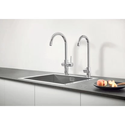 Das Grohe Blue Professional C-Auslauf Set besteht aus einer Grohe Blue Mono Armatur mit Filterfunktion und einem Grohe Blue Professional Kühler.