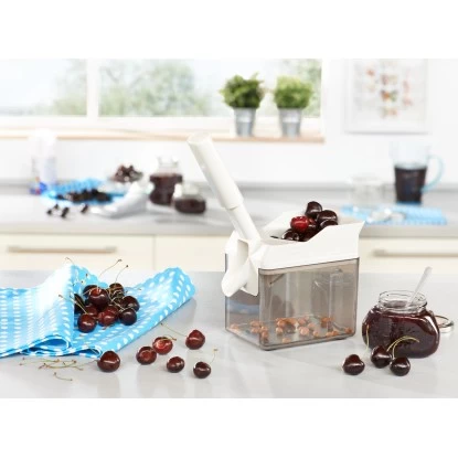 Der Küchenhelfer entkernt frische und konservierte Kirschen schnell und einfach. Dabei rollen sie alleine und nacheinander in den Einfüllbehälter. In nur einer Stunde lassen sich 12 kg frische Kirschen oder der Inhalt von 12 Einmachgläsern entkernen. Möglich macht es die besondere Form des Cherrymat. Die Kirschen werden in eine Einfüllschale gefüllt und rollen nacheinander in den Entkerntrichter. Dort werden sie vom heruntergedrückten Edelstahlmesser sauber in Kerne und Fruchtfleisch getrennt, ohne zerquetscht zu werden.